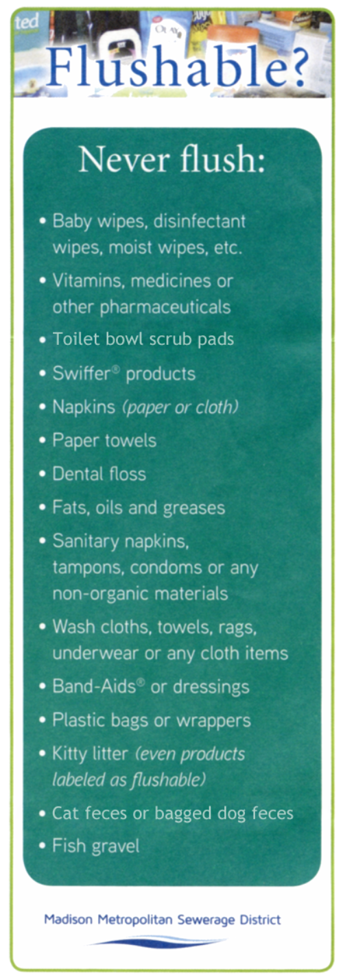 Roto-Rooter® has been clearing clogged drains since 1935, when Samuel Blanc patented the first electric drain cleaning machineand began the Roto-Rooter® franchise business. Modern drain cleaning machines still function pretty much the same way, using blades to cut through the debris and restore proper flow.Today Roto-Rooter® cleans more drains and more sewer lines than any other company in North America. The Roto-Rooter® name is synonymous with quality service backed by years of experience. Roto-Rooter® will unclog your drain, recommend a maintenance interval and/or product and provide tips for keeping your drains flowing freely. We are experts at solving all types of drain and sewer line problems:•Kitchen drains clog over time. They run slower and slower as greases, soaps, fats and detergents build up on the inner walls of the pipes and eventually cause blockage. A Roto-Rooter® service technician who specializes in kitchen plumbing jobs will use a Roto-Rooter® sink machine to cut through the clog and remove all debris.•Shower and tub drains present their own challenges. The clog culprit is usually hair and soap buildup in the trap and drainpipe. A service technician skilled in shower repair techniques will use one of Roto-Rooter's tub and shower drain cleaning machines to cleanse the drain of any and all debris, restoring it to new condition.•Bathroom sink drains may become clogged with hair, toothpaste, soap and grime. Roto-Rooter® provides many bathroom plumbing solutions and sink drains are one of the more common problems we solve. Roto-Rooter will remove the clog and thoroughly clean the entire pipe so your sinks will drain like new.•Toilet drains are sometimes overwhelmed with toilet paper and even the occasional kid's toy. Roto-Rooter® can solve the problem with a Roto-Rooter machine that feeds a spinning cable into the toilet drain. The cable has special spring loaded blades on the tip that will cut through any obstruction while hugging the inside wall of the pipe and thoroughly cleaning it to restore full drainage and powerful flushes.•Floor drains are common in basements, laundry rooms and garages. They may also be found on patios and driveways as well as older bathrooms. These drains are equipped with a trap that should be kept filled with water to prevent odors and sewer gas from escaping. You should test drains occasionally to make sure they are aren't clogged and are ready to carry away water and prevent flooding. Dirt and debris can clog floor drains but Roto-Rooter® can open them quickly to restore good drainage.•Downspout drains help to channel water from roof gutters away from your home. Many downspouts are connected to the city's storm sewer system via underground pipes which can become clogged with leaves and debris and cause a backup. Roto-Rooter® provides professional sewer and drain services that clean downspouts and their connecting pipes to prevent flooding and restore proper drainage around the home.And finally, Madison Metropolitan Sewage District answers the question; What’s Flushable?