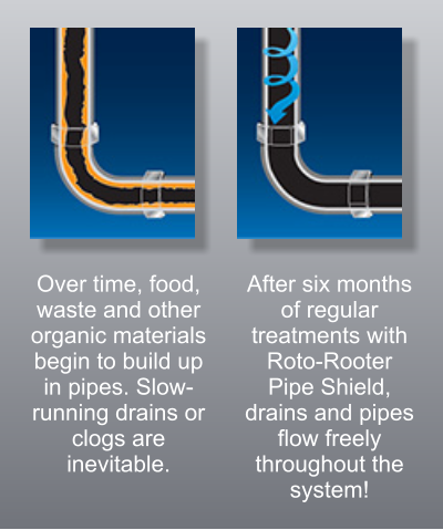 Pipe Shield doesn't remove clogs—it actually prevents organic materials such as fats, grease, soaps, and detergents from building up in your drain and causing clogs. It's an easy and economical way to keep clogs from recurring. Just one gallon (128 oz.) provides 64 treatments when used as directed. Powerful Clog Prevention That's Safe for the Environment Pipe Shield is specifically formulated with the environment in mind, that’s why our active ingredient is a natural biological solution that contains no harsh or toxic chemicals. And, Pipe Shield treats the whole plumbing system, not just the sink trap, to keep drains flowing freely, for up to 30 days. Roto-Rooter Pipe Shield has been officially accredited "Green" by EcoLogo. As a certified product, EcoLogo provides assurance that Roto-Rooter Pipe Shield meets stringent environmental standards. NSF has also approved our Pipe Shield product, which means that it is safe to use around food products. How to Use Pipe Shield Apply once a month to kitchen, bathroom, shower, tub and other drains. Add 2 oz. (1/4 cup) of Pipe Shield to 32 oz. (4 cups) of warm water and pour into drain. Let it stand overnight, then flush with hot water for one minute. For problem drains, use Pipe Shield once a week. Download SDS Sheet - English (PDF) Download SDS Sheet - Spanish (PDF)